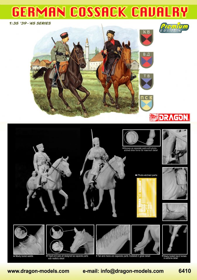 With their breeches, traditional headgear, and shashka (sabers), the two “German” Cossacks have a unique appearance. Of special note is that these cavalrymen have received fresh new mounts to gallop on! The horses are made to Dragon’s stringent Gen2 standards, as is all the relevant horse-riding paraphernalia. This means the horses possess phenomenal detail, and form a valuable equine source for dioramas and vignettes. There is also a fret of photo-etched parts for items such as the reins and stirrups, which offer a maximum amount of detail. There are still an estimated 150,000 Cossacks enrolled in Russian military service today, but Dragon has succeeded in resurrecting some of their WWII forebears. This Premium Edition set makes an up-to-date and ideal pairing of horse and man, a combination restricted only by the modeler’s imagination!