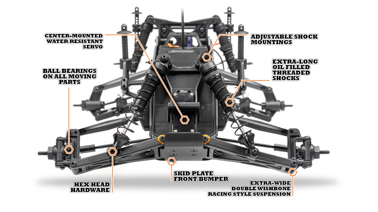 Unter dem schlanken Rennkörper des Jumpshot SC V2 ist das Chassis ein TVP-Design im Savage-Stil (Twin Vertical Plate) für ein supersteifes Chassis und ein mittleres Gewicht. Das modulare Design des Chassis bietet Ihnen einfache Wartung und dauerhaften Crash-Schutz für die gesamte Elektronik. Die Batterie ist schnell von unter dem LKW zugegriffen, so dass der Wechsel der Batterien ist extra-schnell für mehr Fahrspaß!