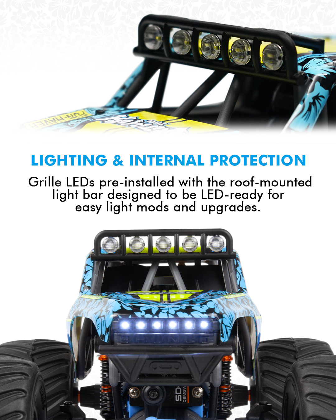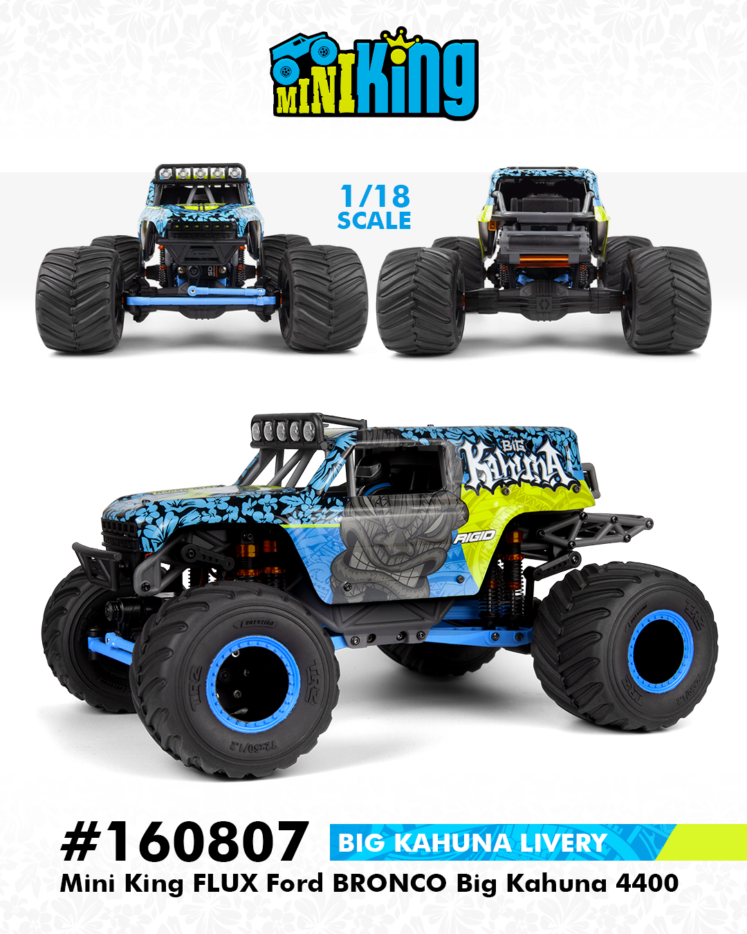 Das Komplette ist der voll lizenzierte Ford Bronco 4400 Bodyshell, eine RC-Replik, die vom echten Big Kahuna Truck inspiriert wurde, der von Shane England mit Hilfe von RTR Vehicles und Vaughn Gittin Jr. betrieben wird. Motorsport. Mit einem detaillierten Innenraum, einem internen Überrollkäfig und einer funktionierenden LED-Grillleiste verleiht dieser atemberaubende Körper dem Mini-King authentischen Big-Kahuna-Stil und Realismus.