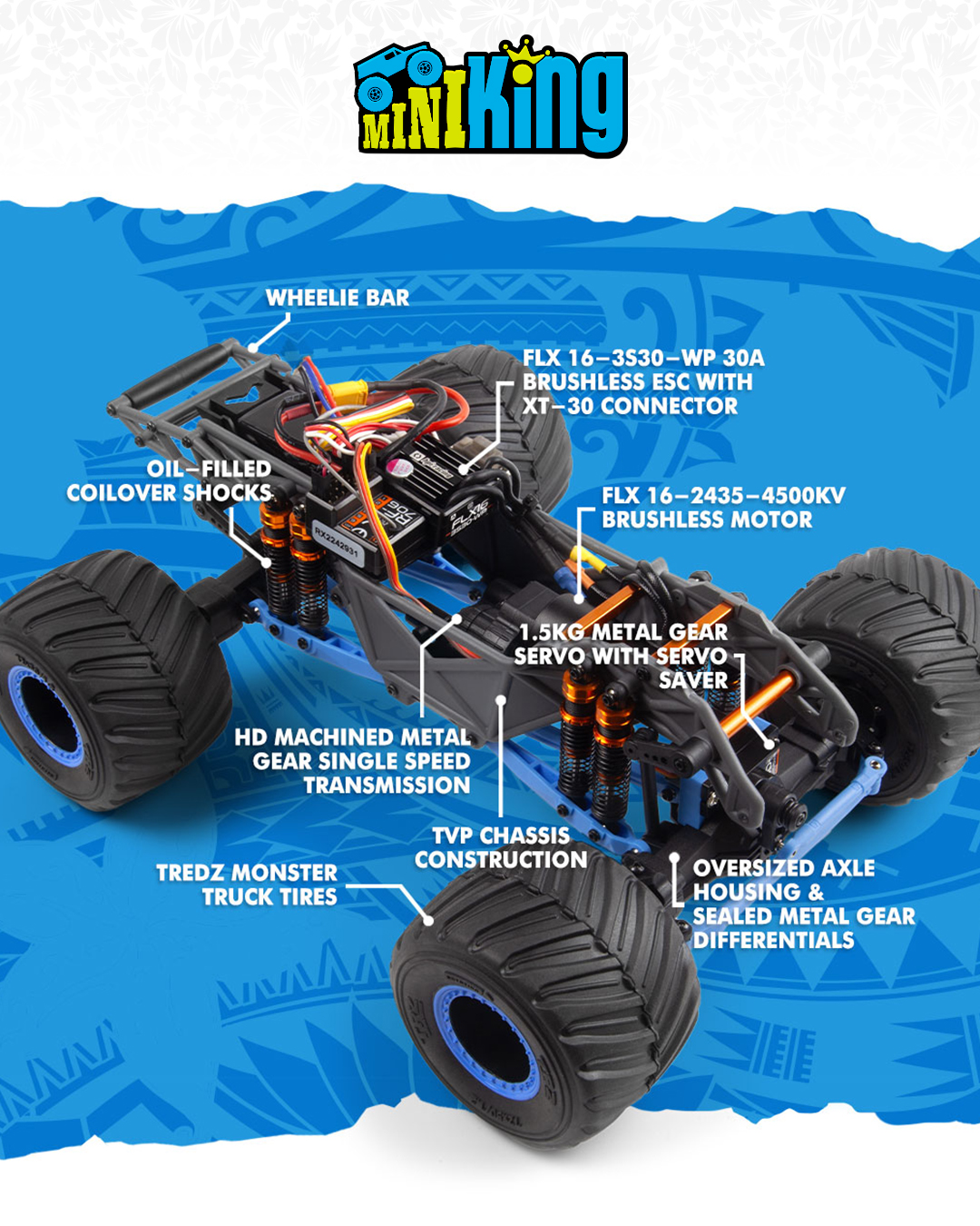 Angetrieben ausschließlich von der Flux Brushless-Technologie, stanzt der Mini-King weit über seine Größe hinaus. Wir sind zuversichtlich, dass Ihre Geschwindigkeit, ihr Drehmoment und ihre Kontrolle Sie absolut wegblasen werden.