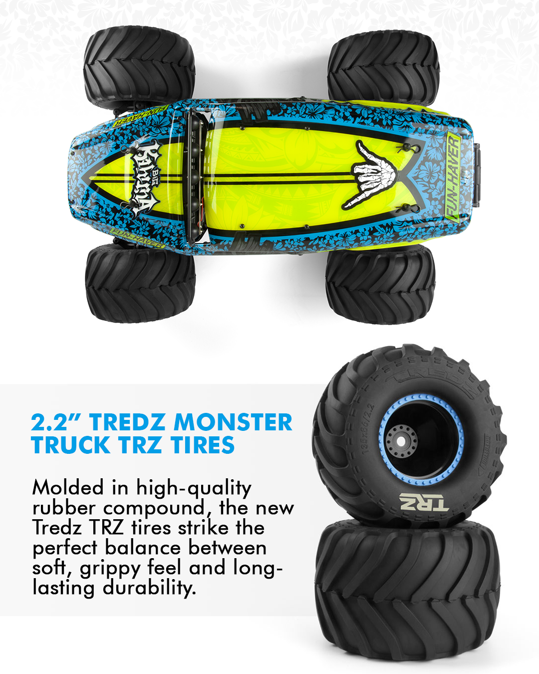 Kein Monstertruck ist komplett ohne ein ernsthaftes Set von Schuhen, und der Monster King Big Kahuna liefert mit Stil. Brandneue 2,2" 56mm breite Monster-Truck-Räder verleihen dem Truck eine mutige, aggressive Haltung, perfekt abgestimmt auf die neuen Tredz TRZ 135x86mm Reifen. Diese speziell für den Monster King entworfenen, griffigen TRZ-Reifen verfügen über ein tiefes, offenes Profil, das sowohl auf Schmutz, Gras, Kies als auch auf Asphalt hervorragende Traktion bietet. Egal, ob Sie Wheelies ziehen, Steine klettern oder den Hinterhof aufpeppen, diese Reifen sind für die Leistung gebaut.