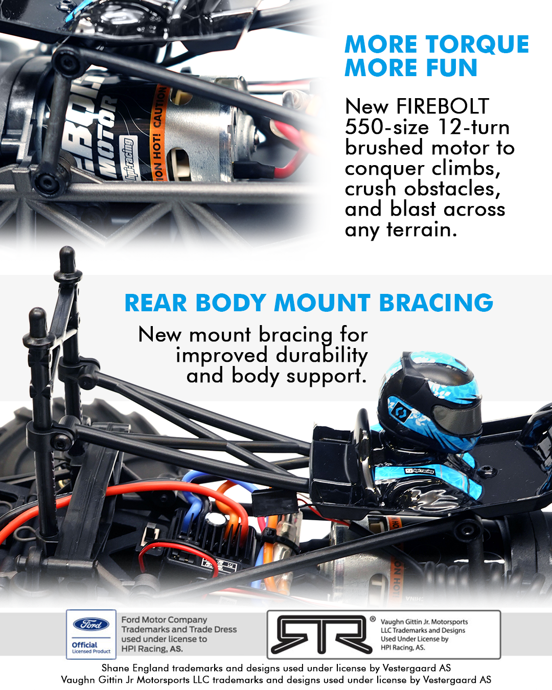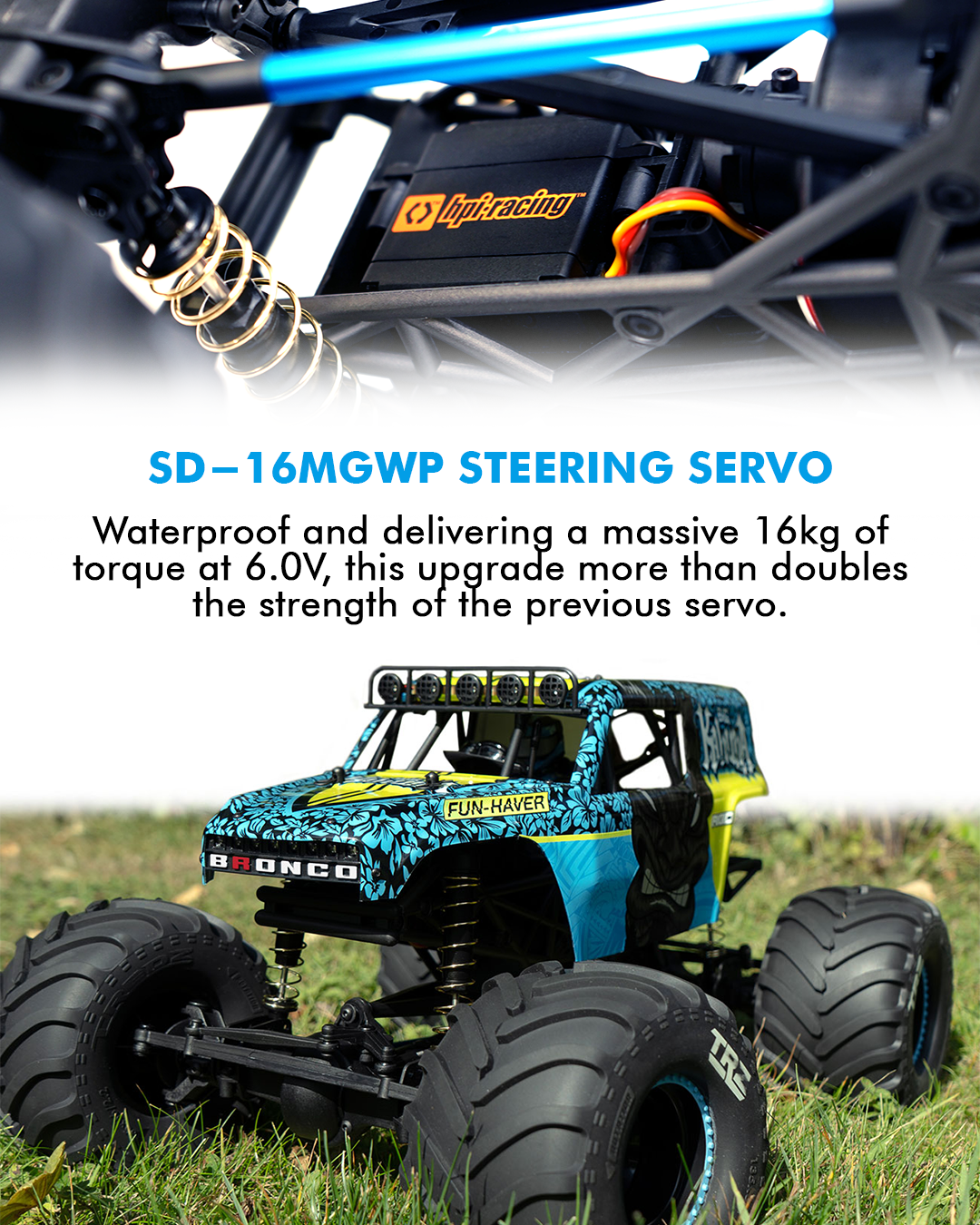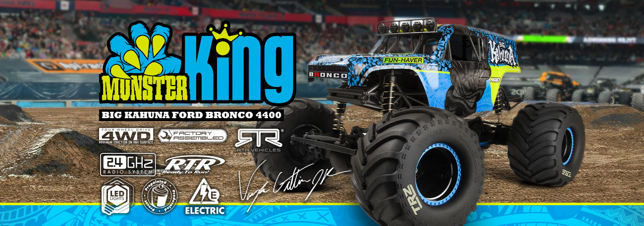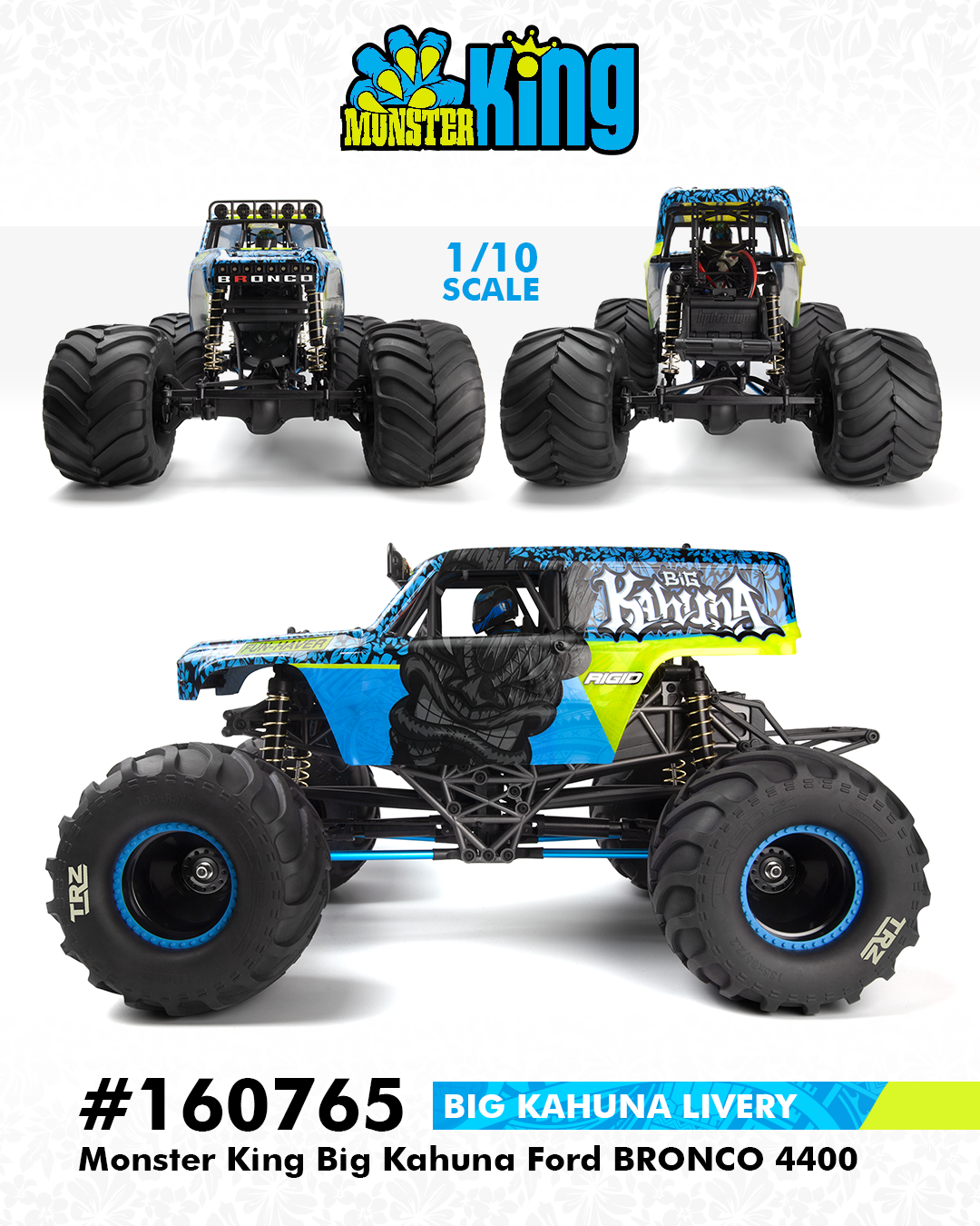 Das Komplette ist der voll lizenzierte Ford Bronco 4400 Bodyshell, eine RC-Replik, die vom echten Big Kahuna Truck inspiriert wurde, der von Shane England mit Hilfe von RTR Vehicles und Vaughn Gittin Jr. betrieben wird. Motorsport. Mit einem detaillierten Innenraum, einem internen Überrollkäfig und funktionierenden LED-Lichtleisten bringt dieser atemberaubende Körper den Monster King mit authentischem Big-Kahuna-Stil und Realismus.