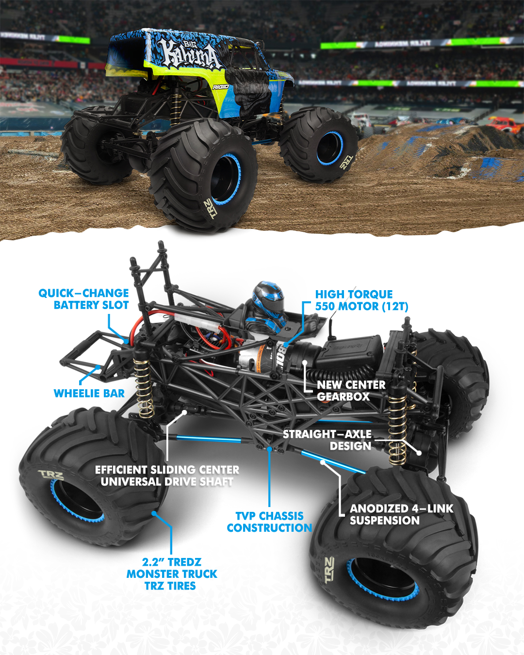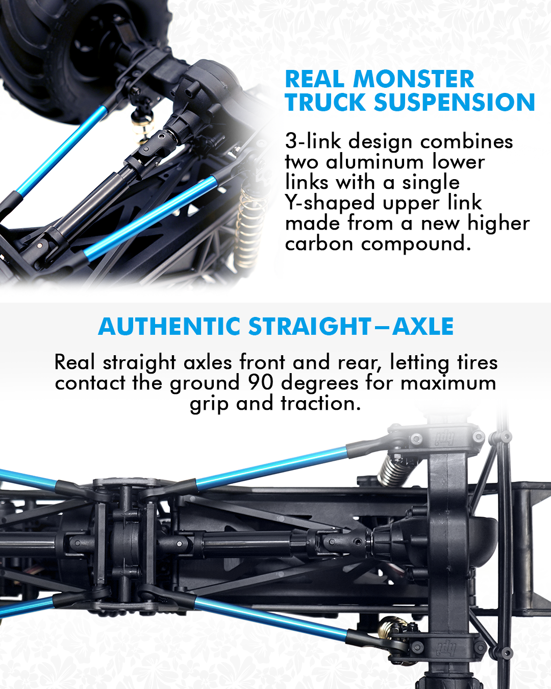 Der Monster King basiert auf einer raffinierten Version des ursprünglichen Wheely King-Fahrwerks und verfügt über ein neues Mittelgetriebe mit externer Slipper-Kupplung, einer verbesserten Lenkgeometrie und einer neuen Hex-Hardware für eine einfachere Wartung. Jede Änderung, die mit der Leistung und dem Spaß im Hinterkopf gemacht wird - von den Lock-Nut-Aufhängungen, die E-Clips für immer verbannen, bis hin zu den robusten neuen Tredz-Reifen, die um breite 2,2 "MT-Räder gewickelt sind.