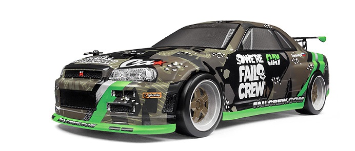 The Micro RS4 Drift has always been one of HPI Racing's most fun and action-packed cars, and now it's available fitted with the always cool Nissan Skyline GT-R in jaw-dropping Fail Crew camo colors, as driven by 'Mad' Max Tvardovsky! This is a perfect 1/18 scale version of Max's own GT-R and is dripping with ultimate coolness, from the bright green front splitter to the huge rear wing! Completely wrapped in its green and brown camo-style Ciay designed livery covered with skulls this is the perfect car to make a statement on track!