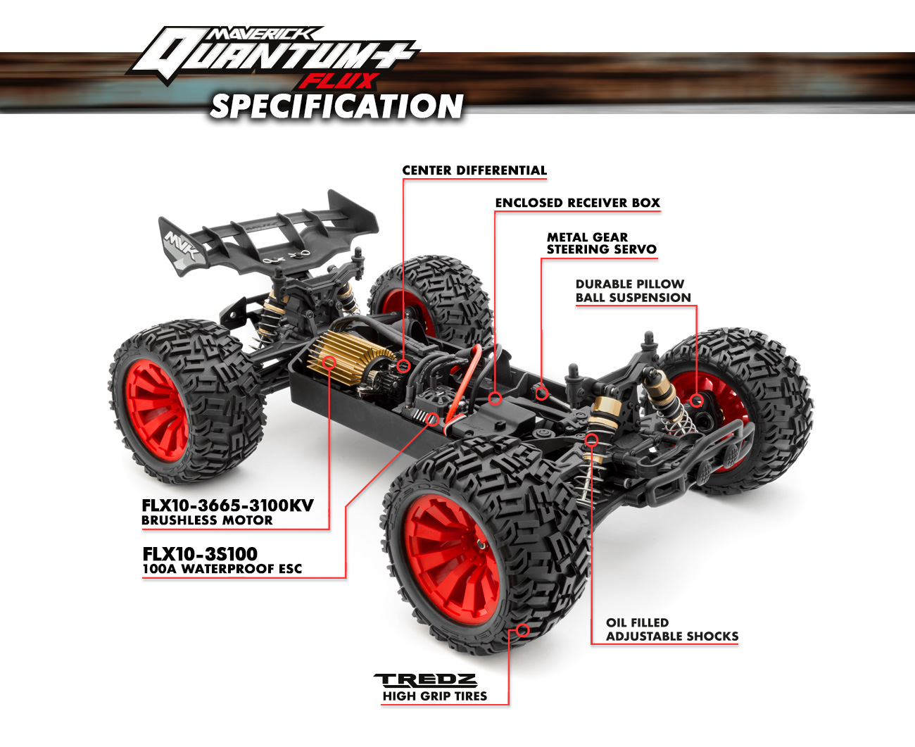 Mit einem 3665 3100KV FLUX Brushless Motor mit 5.0mm Welle und einem 100A wasserdichten ESC sind wir zuversichtlich, dass der Quantum + FLUX seine Wirkung nicht verfehlen wird!
