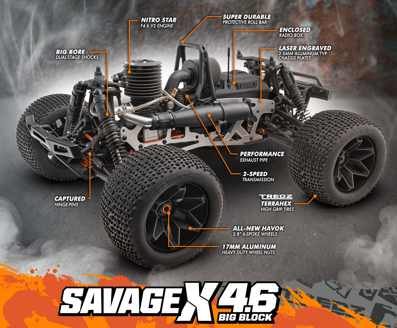Der massive F4.6 Big Block Motor ist für eine Sache und nur für eine Sache ausgelegt - enorme PS-Zahlen! Fast 3 PS sogar! Genug PS, um den Savage X 4.6 auf über 73 km/h zu bringen! Und Big Block TORQUE ist immer auf dem Laufenden, ziehen Sie einfach den Gashebel für sofortigen Nervenkitzel.