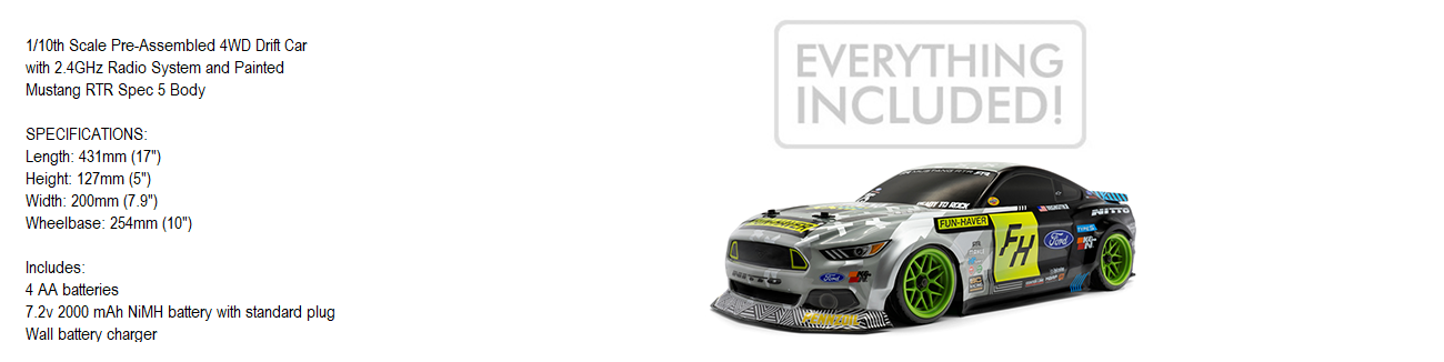 Unter der Haube ist dieser Mustang RTR im Maßstab 1:10 mit dem neuesten HPI Racing Touring Car-Chassis, dem Sport 3, ausgestattet. Mit permanent wellengetriebenem Allradantrieb, einem vollständig abgedichteten Antriebsstrang, wasserdichter 2,4-GHz-Elektronik und Funkgetriebe sowie einem völlig unabhängigen Doppelquerlenker Dank der Federung und den einstellbaren, ölgefüllten Stoßdämpfern ist es bereit, unter allen Bedingungen zu rocken.