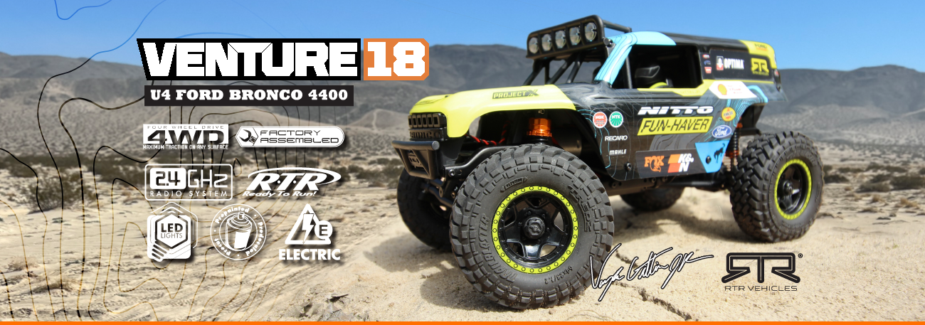 Der Venture18 U4 Ford Bronco 4400 ist vollständig Ready-to-Run (RTR), komplett mit einem 600mAh LiPo-Akku und USB-Balance-Ladegerät - alles, was Sie brauchen, um die Trail direkt aus der Box zu kommen. Egal, ob Sie über Felsen hüpfen oder durch Ihr Hinterhofgelände fahren, dieser kompakte Trail-Truck sorgt bei jedem Antrieb für großen Nervenkitzel.