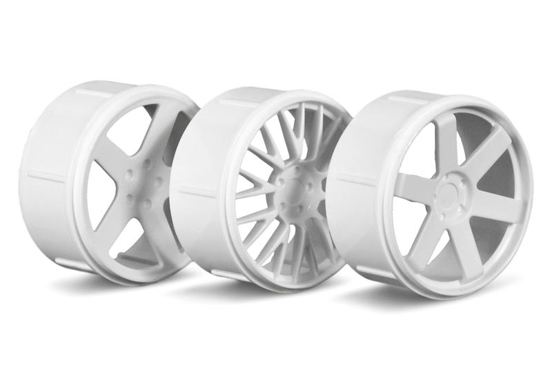 Das HPI Micro RS4 Felgen Set enthält 3 Satz Felgen(3 Paar Front und 3 Paar Heckfelgen) - jeweils ein Satz Vielspeichen, 5-Speichen und 6-Speichen Felgen.