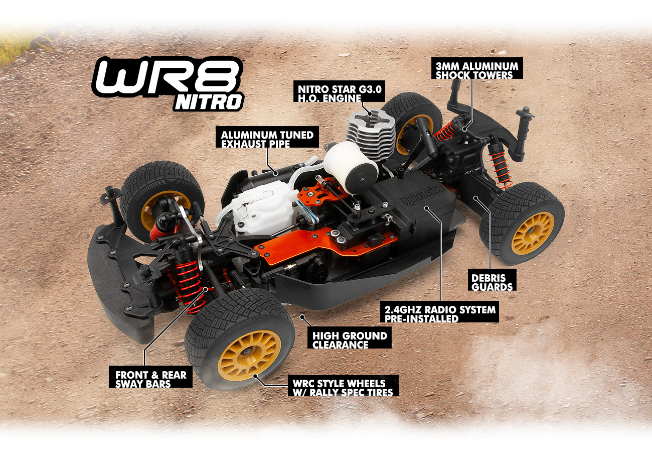 Wie alle HPI Racing RTR (Ready-To-Run) Autos ist der WR8 3.0 komplett vorgebaut: Alles, was Sie tun müssen, ist Sender hinzuzufügen und Empfängerbatterien, Nitro-Kraftstoff und Sie sind bereit zu starten im Motor!
